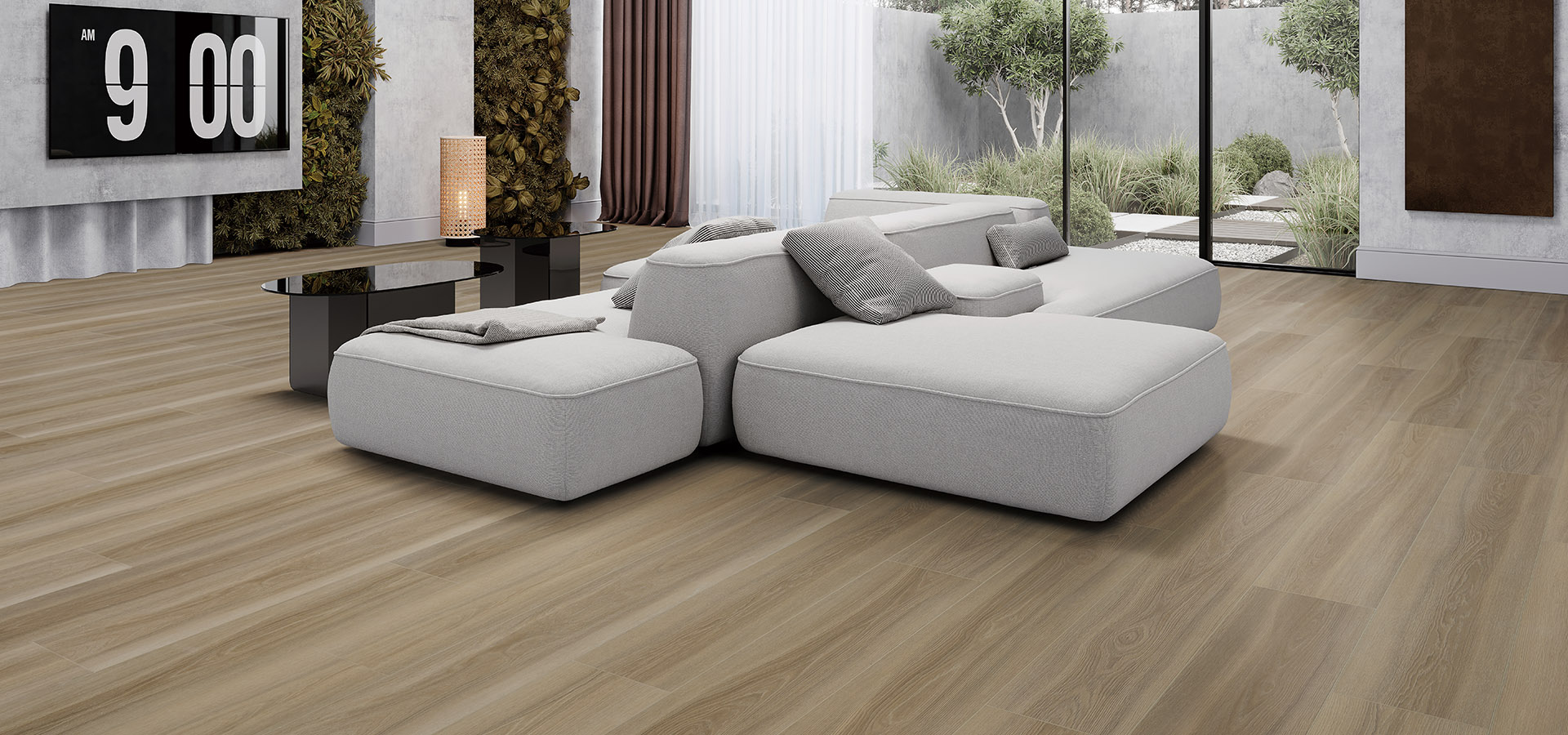 Ultra-clear French Oak visual capturing dynamic grain patterns and color variations only seen on real wood; further heightened by the registered embossing technique that follows the swirling grain and brings real-wood texture to luxury vinyl