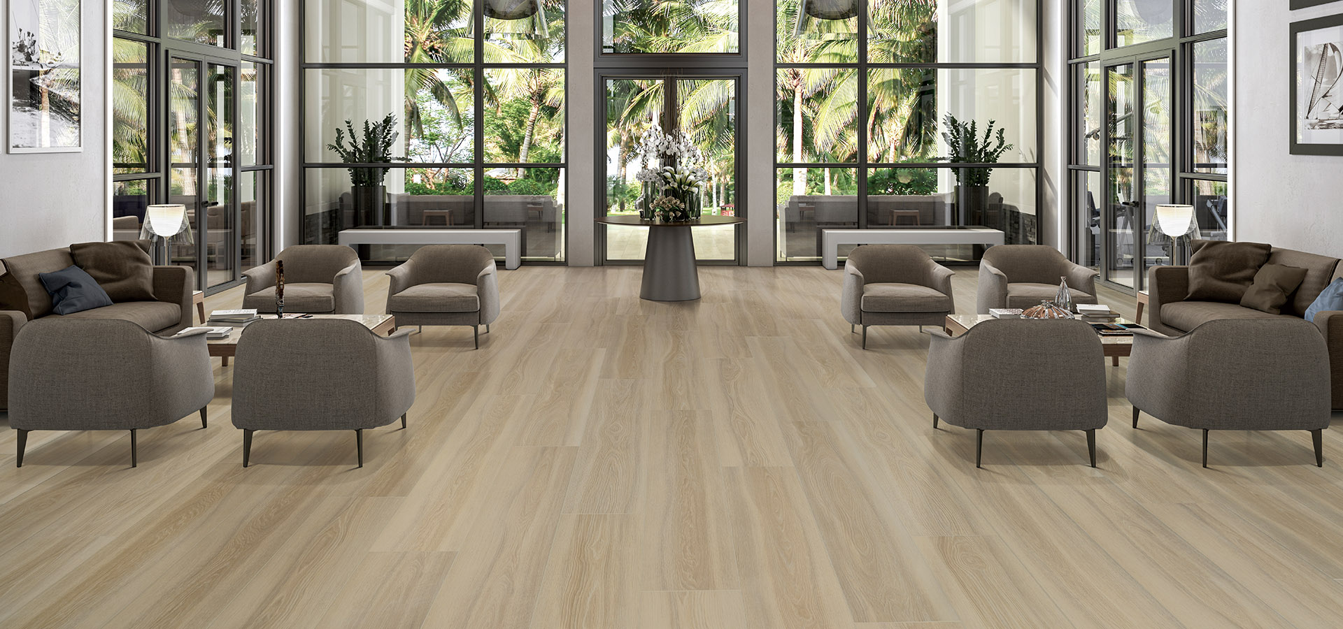 Ultra-clear French Oak visual capturing dynamic grain patterns and color variations only seen on real wood; further heightened by the registered embossing technique that follows the swirling grain and brings real-wood texture to luxury vinyl