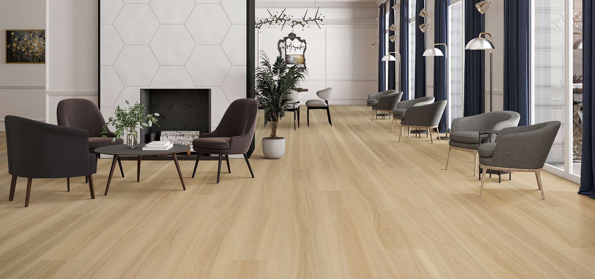 Ultra-clear French Oak visual capturing dynamic grain patterns and color variations only seen on real wood; further heightened by the registered embossing technique that follows the swirling grain and brings real-wood texture to luxury vinyl