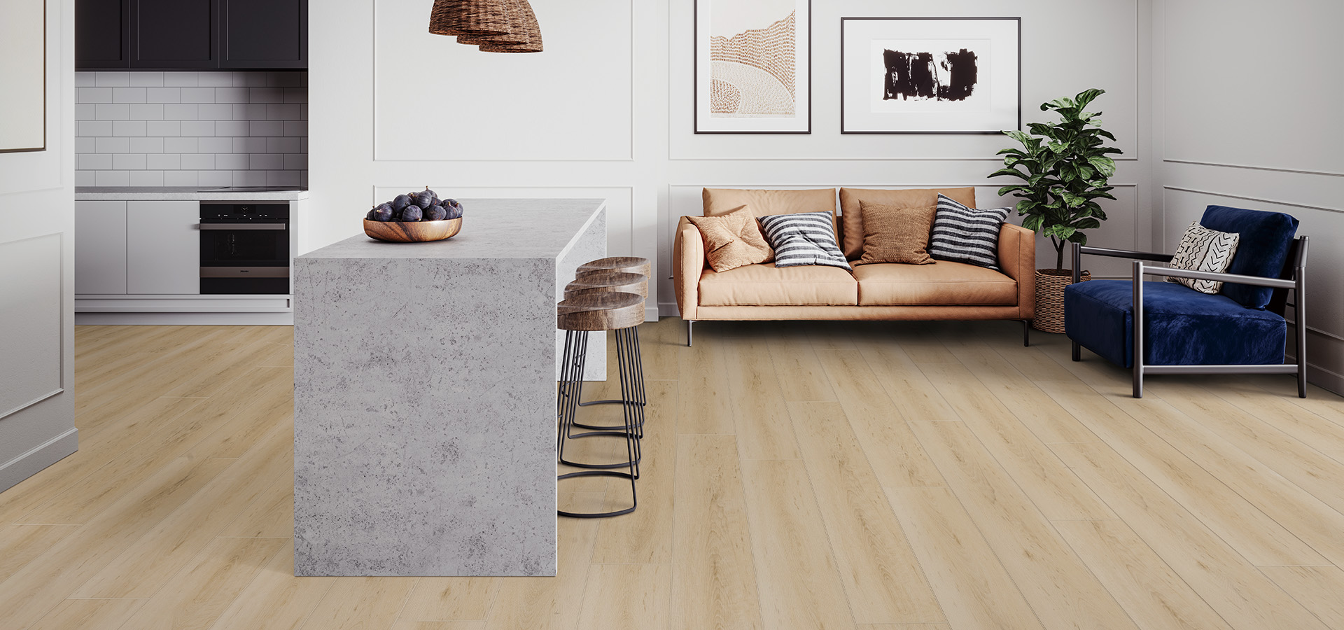 Embossed wide and long planks with elegant maple visual enhanced by a timeless low-gloss finish for versatile design